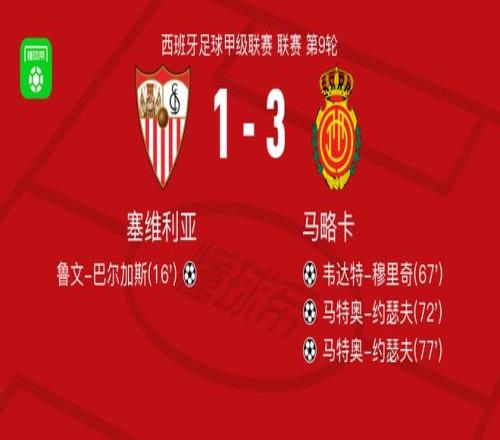 北京时间10月18日西班牙足球甲级联赛 联赛 第9轮,塞维利亚主场对阵马略卡。塞维利亚鲁文-巴尔加斯破门。马略卡韦达特-穆里奇破门,马特奥-约瑟夫梅开二度。最终比分塞维利亚 1-3 马略卡。