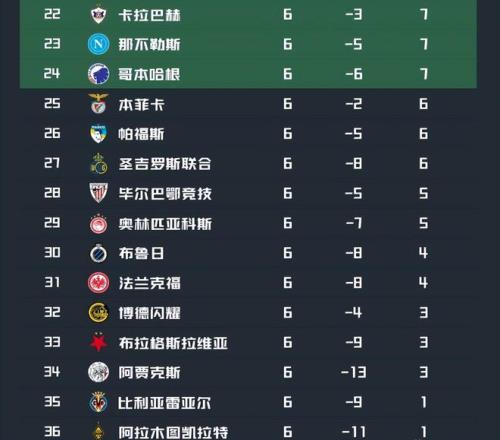 其他位列附加赛区域的还有11分的多特蒙德和热刺;纽卡斯尔、切尔西、葡萄牙体育和巴塞罗那则都是3胜1平2负积10分依次排在第12至第15位。这些球队距离前八晋级区都只需要一场胜利即可;在欧冠剩下2轮的情况下,还有一定的机会冲击晋级区。