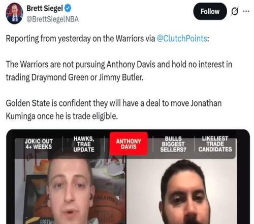 ClutchPoints记者Brett Siegel给出相同说法,指出勇士队不想交易巴特勒与追梦,也没有追求浓眉哥,他们相信只要库明加一符合交易条件,球队就能迅速完成交易补强。